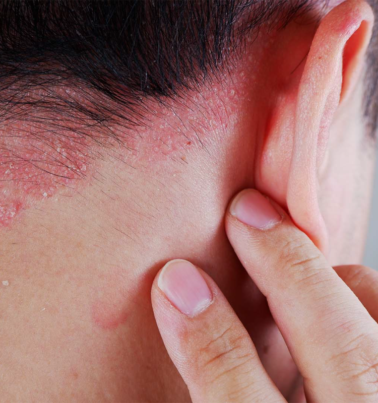 Psoriasis is a chronic autoimmune condition that causes rapid skin cell turnover, leading to raised, red plaques covered in silvery scales. These patches often appear on the scalp, elbows, knees, and lower back, causing itching, discomfort, and potential cracking which increases the risk of infection.